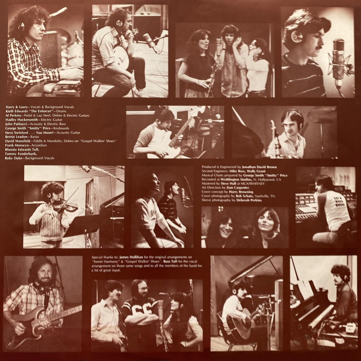 Featuring Harry & Laury on lead and background vocals, backed by George Smith “Smitty” Price on keyboards, Frank Morocco on accordian, Steve Swinford on acoustic guitar, Hadley Hockensmith on electric guitar, Al Perkins on dobro, electric guitars, as well as pedal and lap steel, Bernie Leadon on banjo, David Mansfield of Alpha Band fame on fiddle and mandolin (as well as dobro on track A5), John Patitucci on acoustic and electric bass, and Keith Edwards on drums. Background vocals provided by Rhenda Ewards Tull, Tommy Funderburk, and Roby Duke.