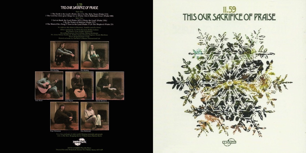 This Our Sacrifice of Praise is the sole album by the British folk group 11.59, released in the UK on Dovetail Records in 1974. The album and recorded by Don Feltham and Helmut Kaufmann at Echo Studios in Eastbourne, England; with Bobbie Graham producing. Mixed by Kaufmann and Graham. Arranged by the group.