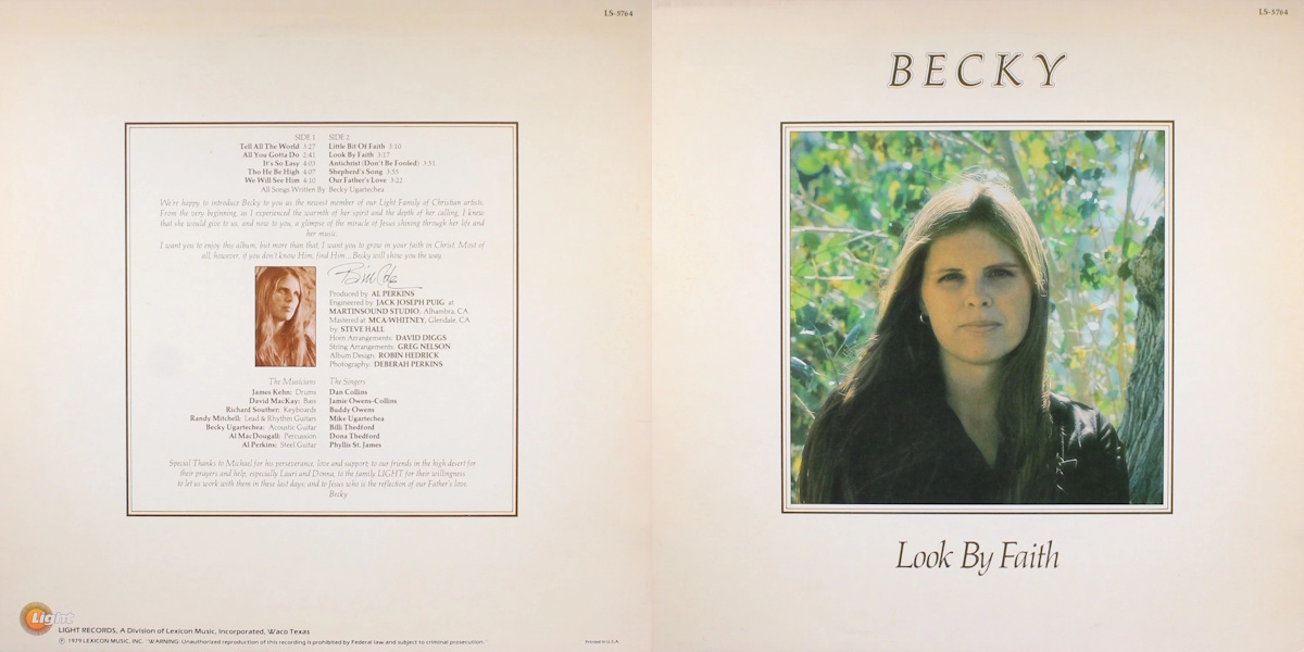 Look by Faith is the sophomore album by the American singer and songwriter Becky Ugartechea, released on Light Records in early 1980. The album was recorded by Jack Joseph Puig at MartinSound Studios in Alhambra, California; with Al Perkins producing. Horn arrangements by David Diggs. All songs written by Becky Ugartechea.
