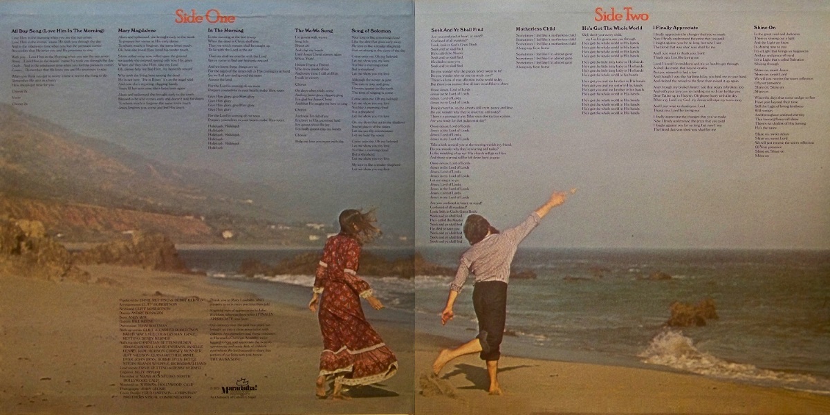 I wouldn’t have minded hearing more songs like the closing six-minute «Shine On», a beautiful moody acoustic piece with dreamy harmonies and elegant cello accompaniment. Debby’s solo rendering of «Motherless Child» (backed only by acoustic guitar) also has a pleasant simplicity. The rest of the record is their usual output of orchestrated MOR, folk/pop and easy listening ballads. «The Wa Wa Song» also shows the first signs of their upcoming interest in children’s music. Includes covers of «He’s Got The Whole World In His Hands», John Fischer’s «All Day Song (Love Him In The Morning)» and Kenn Gulliksen’s «Song Of Solomon». Gate-fold cover. [Ken Scott, The Archivist, 4th edition]