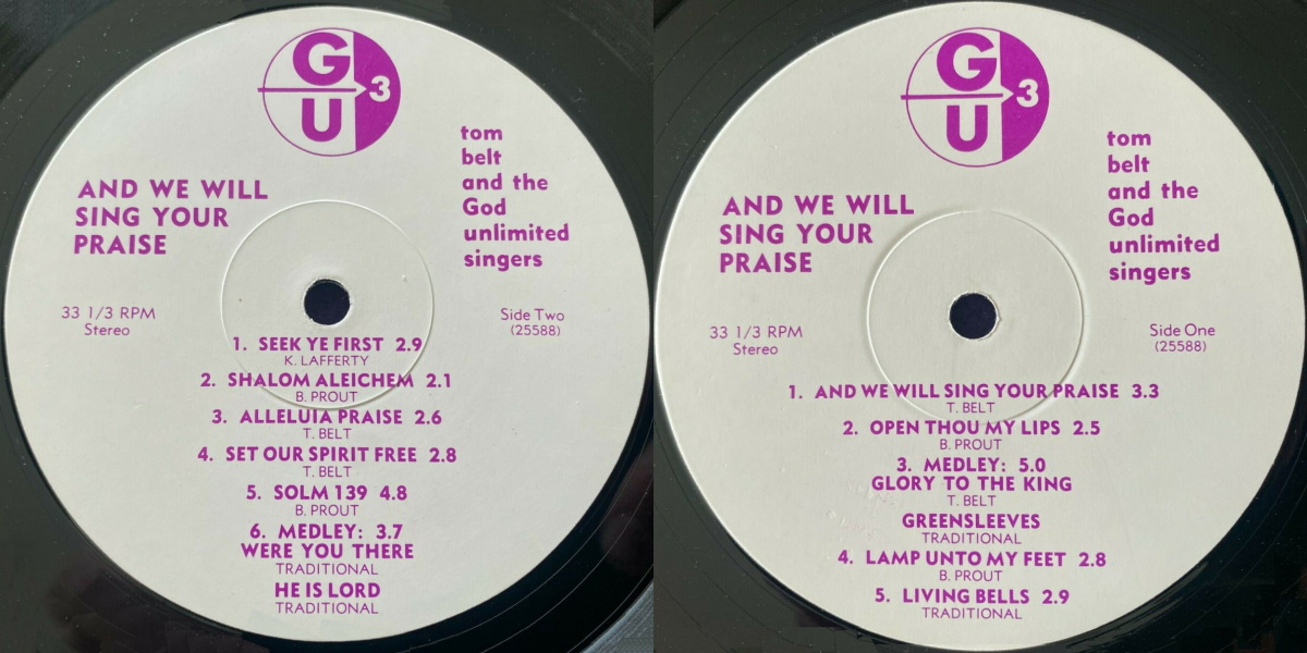 And We Will Sing Your Praise is an album by the American folk-rock group God Unlimited (credited Tom Belt and the God Unlimited Singers), self-released on their own label GU in 1975. “Recorded in Scottsdale, Arizona at the beautiful studio of engineer, Ed Ravenscroft with the assistance of Mark Alan Spitz.”
