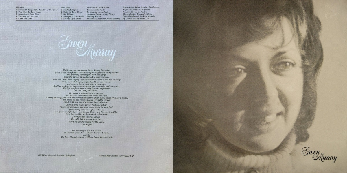 Similar easy-going folk/pop style for Gwen’s debut, albeit without as much country influence. A couple mellow traditional songs, make up for by faithful covers of Ishmael’s «The Sixth Virgin (Parable Of The Ten)» and Water Into Wine Band’s «Stranger In The World». John Pantry on keyboards, Andy Piercy on acoustic guitar. Gwen was also backing vocalist on Len Magee’s early Dovetail LPs – in fact her music here is very similar to Len’s. [Ken Scott, The Archivist, 4th Edition]