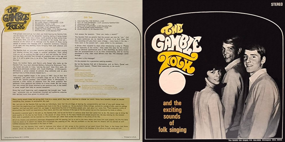 Long-running Minneapolis folk trio of Renee Gamble, Steve Gamble and Gary Gamble. Boy, they sure look young on this obscure custom debut. And boy, they sure sound dead-on like The Seekers with their ’60s folk style. Clean production highlights their articulate moving harmonies and sharp acoustic backing (guitar, string bass and drums). Thirteen selections including standards like «What’s That I Hear?», «My Lord, What A Morning», «Sin Bound Train» and «You can Tell The World», but the best songs are the six Gamble Folk original, especially «All Alone», «Sold For A Farthing» and «Dear Jesus». A much more satisfying recording than the usual ho-hum collegiate folksters of the time. Says on the back that they began singing together in the spring of 1967, did street performances in Minneapolis “poverty pockets”, attended Bethany Fellowship Mission Training Center and worked with the drug-prevention group Youth Challenge. [Ken Scott, The Archivist, 4th Edition]