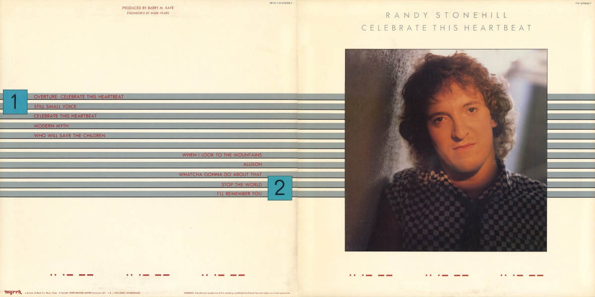 Celebrate This Heartbeat is the seventh studio album by the American singer and songwriter Randy Stonehill, released on Myrrh Records in April 1984, a division of Word. The album was recorded and mixed by Mark Heard at his studio Fingerprint Recorders in Montrose, California; with Barry Miller Kaye producing. Orchestrated, arranged, and conducted by Tom Howard. Featuring songs like “Who Will Save the Children”, a duet with Phil Keaggy, and “Modern Myth” with background vocals provided by David Edwards and Tonio K. (Trivia: The Morse code on the album jacket spells out “I AM I AM I AM” and the overture has a synth subtly playing the same, as if it was just a musical figure the artist decided would sound nice.)
