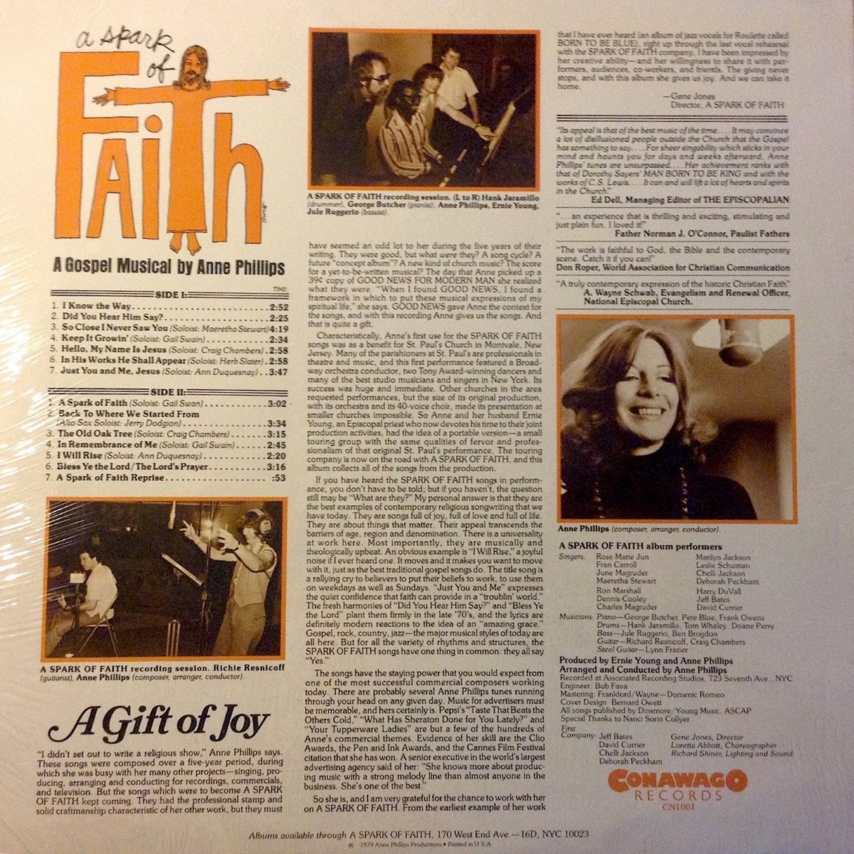 A Spark of Faith, sub-titled A Gospel Musical by Anne Phillips, is an album by the American composer Anne Phillips, released on Conawago Records in 1979. It is the studio version of the live recording A Spark of Faith: A Rock Cantata by Anne Phillips of March 1973, released on ATSF in 1973. The album was recorded by Bob Fava at Asociated Recording Studios in New York City with Ernie Young and Anne Phillips producing. Arranged and conducted by Anne Phillips. Words and music written by by Anne Phillips.