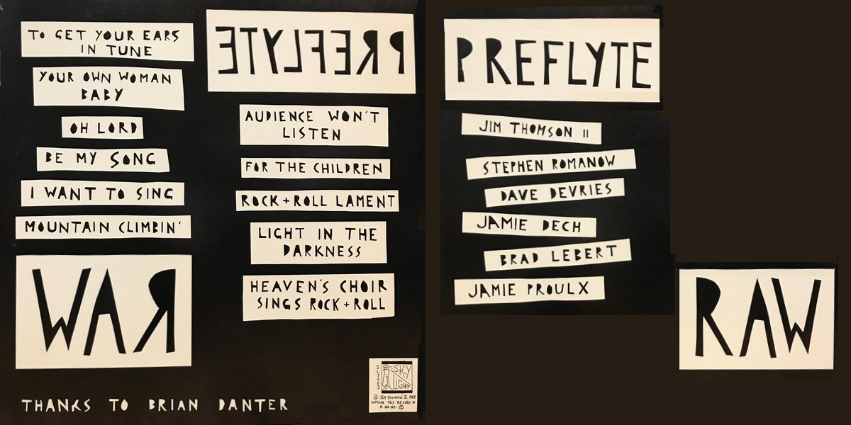 Raw is the sophomore album by the Canadian folk-rock combo Jim Thomson II & Preflyte (this time around credited Preflyte only), self-released on Sky Light in 1983. All songs written by Jim Thomson II except “Mountain Climbing” and “Audience Won’t Listen” co-written with Dave Devries. Preflyte features Jim Thomson II, Stephen Romanow, Dave Devries, Jamie Dech, Brad Lebert, and Jamie Proulx.