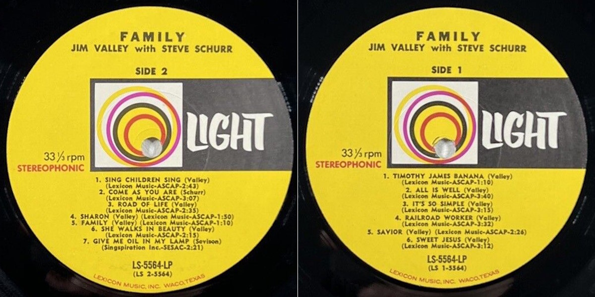 Jim Valley with Steve Schurr - Family (Light Records 1971) LP labels, Side2 and Side1