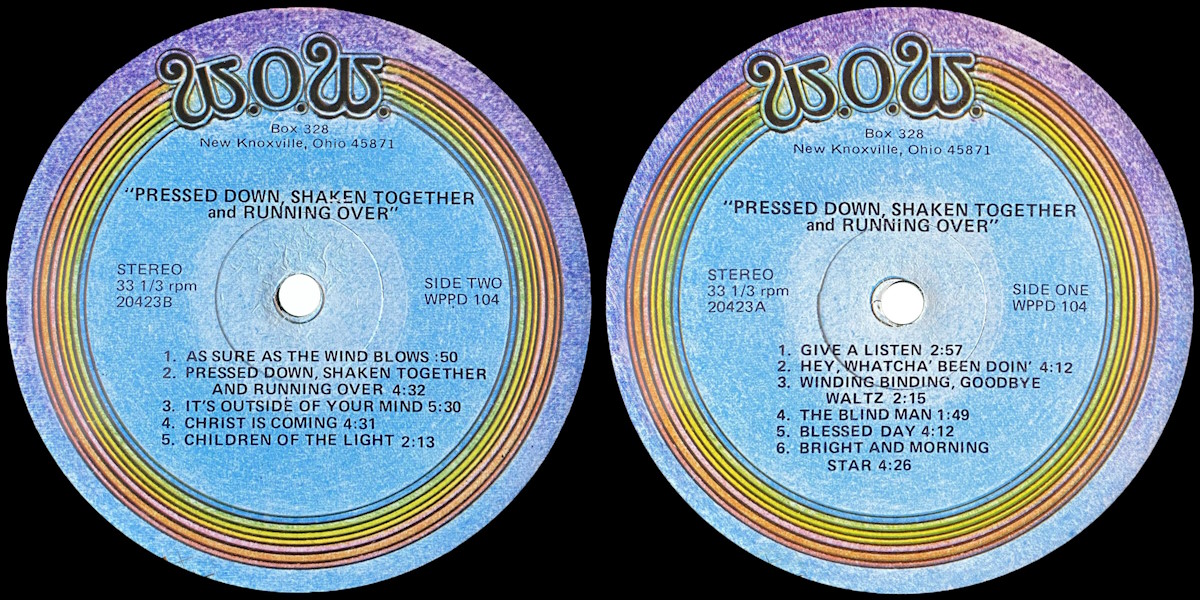 Pressed Down, Shaken Together and Running Over - Pressed Down, Shaken Together and Running Over (WOW 1976) LP labels, Side2 and Side1, 1976 Re-issue Edition