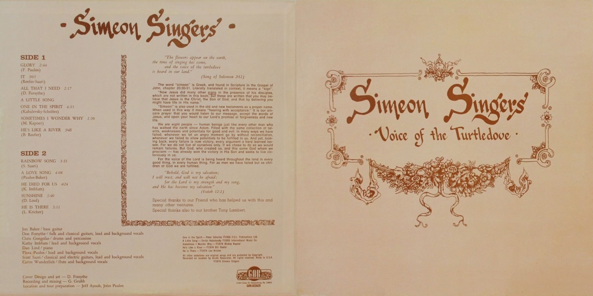 If this were a British private you can bet it would sell in three-digit figures. Coming from America, however, gentle melodic folk groups like the eight-member Simeon Singers tend to be overlooked. Too bad, because Voice Of The Turtledove has some real nice charm at work. Acoustic guitars blend with flute and piano, usually in an artsy finger-picked ballad kind of setting. Mostly originals or obscure covers, along with a rendition of «One In The Spirit» (done in a medley with Kabalevsky’s theme «A Little Song»). Songs like «He Died For Us» and «Sunshine» bring to mind the poignant ballad style of early Children Of The Day. Some basement electric guitar and lively drums bring a heavier edge to «Rainbow Song», while the instrumental «It» flows with a pleasant Fogelberg-ish flair. Recorded in Greensburg, Pennsylvania. [Ken Scott, The Archivist, 4th Edition]