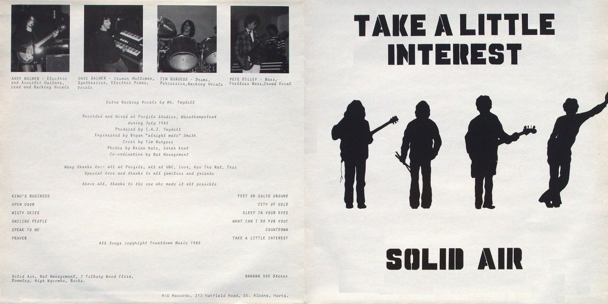 Take a Little Interest is the debut album by the British pop/rock band Solid Air, independently released on Rio Records in 1980, in co-operation with Banana Records. The album was recorded and mixed by Bryan Smith at Profile Studios in Wheathampstead, England; July 1980, with Iva Twydell of After The Fire fame producing. The band features Andy Balmer on lead vocals and guitars, Dave Balmer on keyboards and synthesizer, Pete Dilley on bass, and Tim Burgess on drums and percussion. (Everyone but bassist Dilley later played on Twydell’s solo album Secret Service released the following year.)