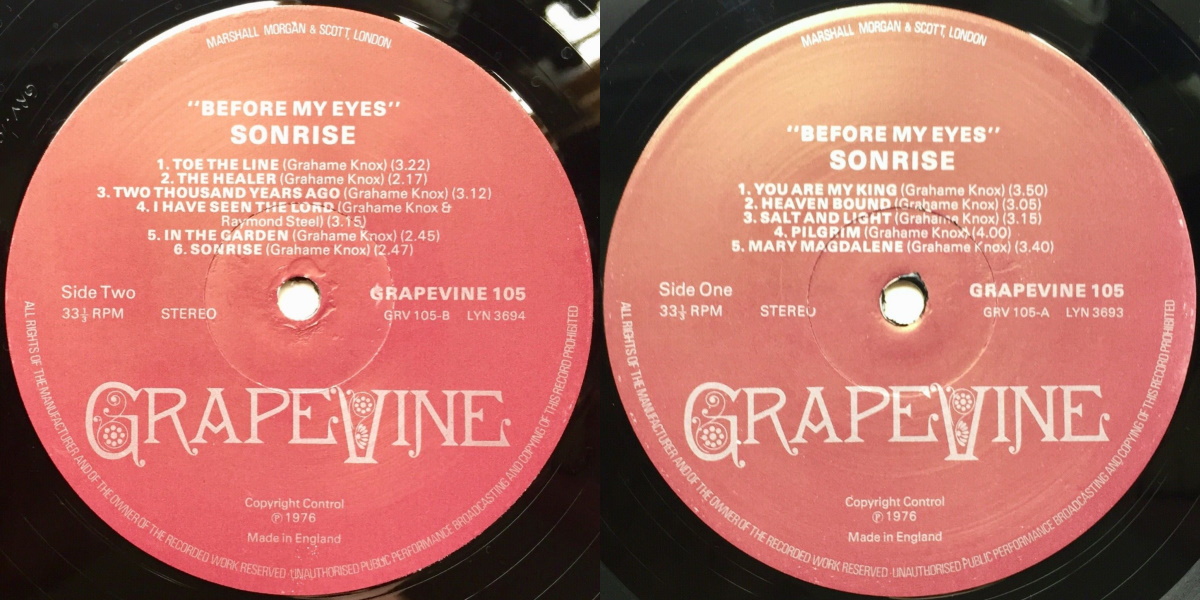 Before My Eyes is an album by the British folk duo Sonrise (Grahame Knox and Ray Steel), released on Grapevine Records in 1976. The album was recorded and mixed (reduced) by Mick John at Canon Sound in Chester, England, with Sue McClellan and Pete Yates-Round producing, both of Parchment fame. All songs written by Grahame Knox.