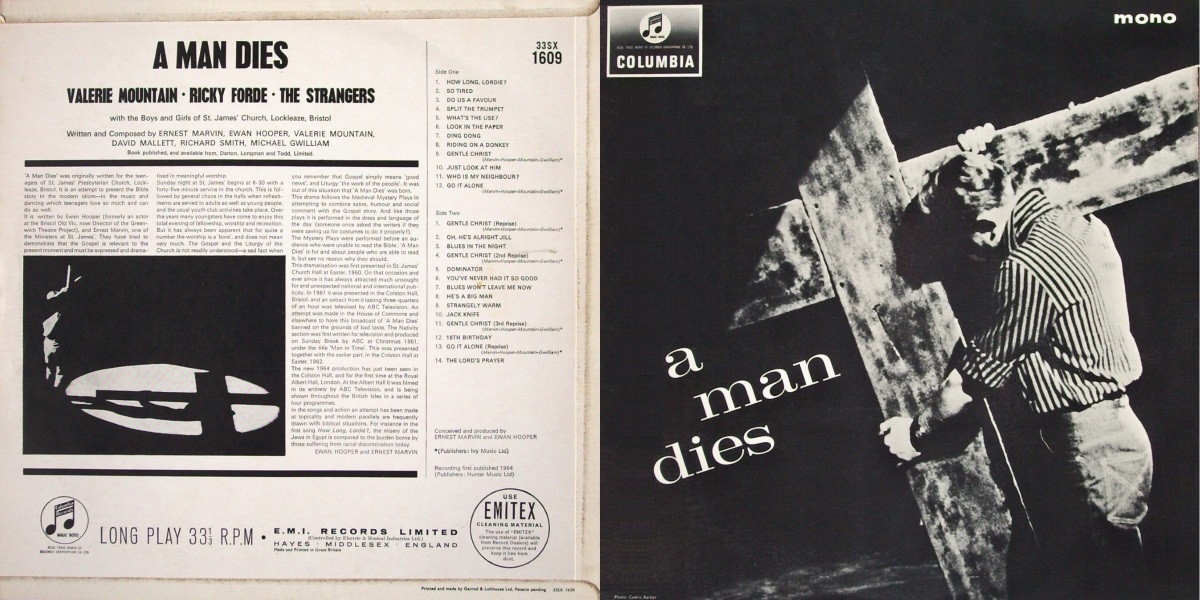 A Man Dies is a multi-artist musical/rock opera released in the UK on Columbia Records in 1964. Featuring Valerie Mountain, Ricky Forde, and The Strangers, with the Boys and Girls of St. James’ Church, Lockleaze, Bristol, UK. Written and composed by Ernest Marvin, Ewan Hooper, Valerie Mountain, David Mallett, Richard Smith, and Michael Gwilliam. Conceived and produced by Ernest Marvin and Ewan Hooper. The first Christian rock album?