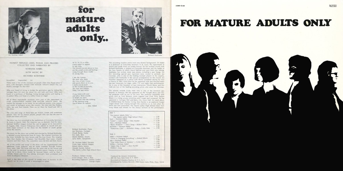 For Mature Adults Only is a musical released in 1968, produced by Mosann Enterprise Recording and distributed by Fortress Records. (“Honest Teenage Cries, Poems and Prayers collected and narrated by Norman Habel with music by Richard Koehneke”.) The album was recorded by George Engfer and Stanley Tonkel at Columbia Recording Studios in New York City with Robert P. Mosley producing for Mosann Enterprises, New York.