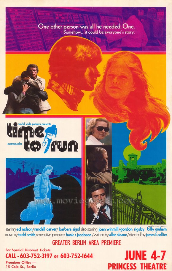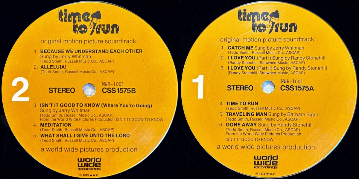 Time to Run is an original motion picture soundtrack written and arranged by the Canadian composer Tedd Smith for a movie by the same name produced by Billy Graham’s World Wide Pictures Production. The album was released by World Wide Recordings in 1973, manufactured by Creative Sound. (Also released by Creative Sound featuring different cover artwork.) The album was recorded by Jerry Barnes with Anthony Harris producing. Orchestrations by Leonard Niehaus. The movie received a Golden Globe nomination for Most Promising Newcomer.