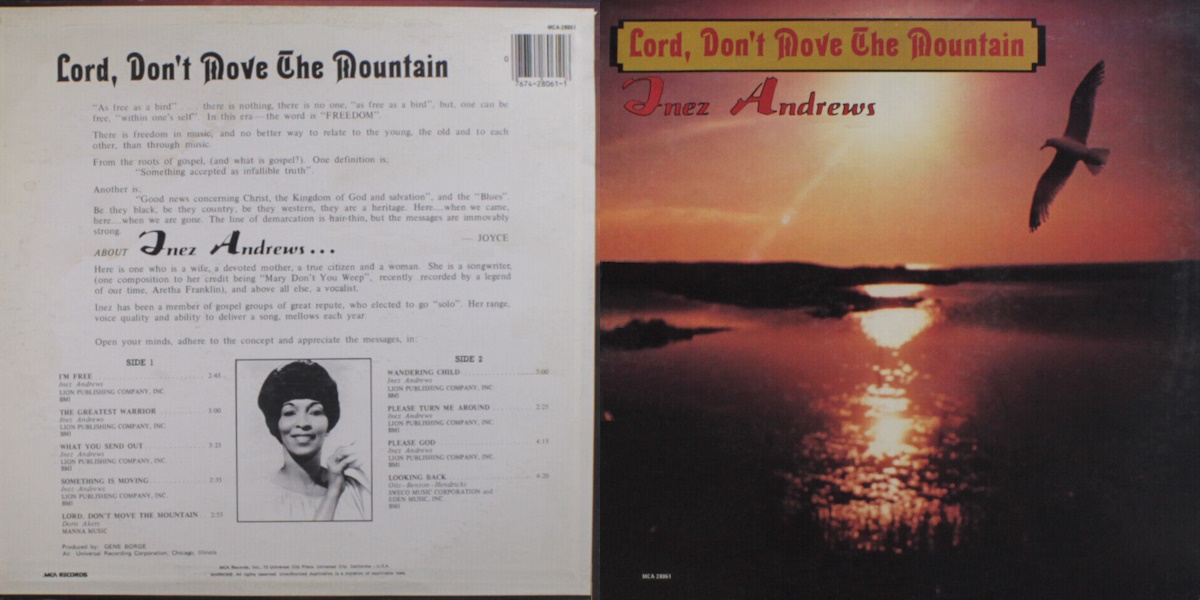Lord, Don’t Move the Mountain is an album by the American gospel/soul singer and songwriter Inez Andrews, released on SongBird Records in 1973, distributed by ABC/Dunhill Records. The album was recorded at Universal Recording Studio in Chicago, Illinois; with Gene Barge producing. All songs written by Inez Andrews except track A5 written by Doris Akers and track B4 co-written by Belford Hendricks, Brook Benton, and Clyde Otis.