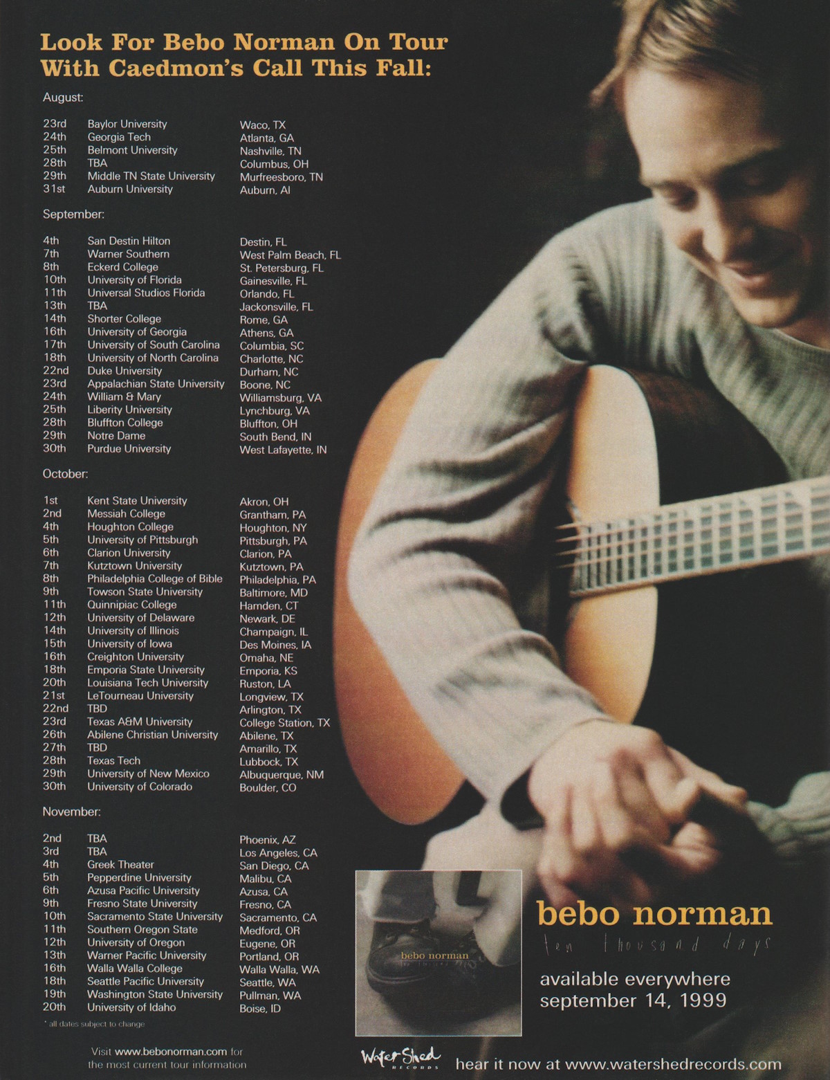 A full-page sized Album and Tour advertisement for Bebo Norman was featured in the October 1999 issue of CCM Magazine.