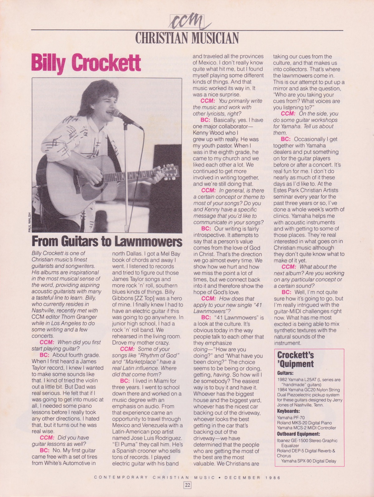 An interview with singer-songwriter and guitarist Billy Crockett was featured in the December 1986 issue of CCM Magazine, as a part of their ongoing Christian Musician Series.