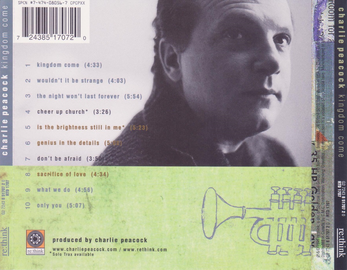 Even at the best of times, Charlie Peacock is not known as a slouch but recently he seems to be excelling himself. Whilst producing the latest Switchfoot album (which is excellent by the way!) he found time to research and write his challening critique of the Christian music industry At the Cross Roads and suddenly found himself being treated as a learned professor and invited onto Christian TV shows that never wanted to know him as an artist! Strange world eh? Consequently ‘Kingdom Come’ is Charlie playing it safe, making inroads into the lives of a new group of people who are just discovering his music afresh. But then safe for Charlie Peacock doesn’t spell bland! Like ‘The Secret Of Time‘ a decade ago, ‘Kingdom Come’ simply pulls in the reins on his more experimental moments and gives you 10 expertly crafted thought-provoking songs. Some simple but devastatingly effective musical performances and the sort of top class spit and polish that has established Peacock as one of CCM’s most wanted producers make this a delight. I witnessed a solo performance of the brilliant self-examining «Is The Brightness Still In Me» when I visited Nashville recently and it strikes me that most of these songs, built as they are around Charlie’s solo piano, would stand up to unplugged solo presentations. As usual, Peacock’s distinctive voice picks it way through the questions and searching songs he has penned and this time, uppermost in his mind is the Kingdom Of God. Not a normal subject for a CCM album, but definitely timely. He manages to walk the path of maintaining a deft musical touch whilst lyrically wrestling with the vastness of God and The Kingdom. Favourite moments? Hard to narrow it down! I like the powerpop rock of «Don’t Be Afraid», the delicate vulnerability and gorgeous Beatlesy melody of «Only You» and the jazzy tinges of «The Night Won’t Last Forever». Overall this is classy stuff from a man who even when he understates says more with one album than some artists manage in a lifetime! [Mike Rimmer, Cross Rhythms, August 1999]