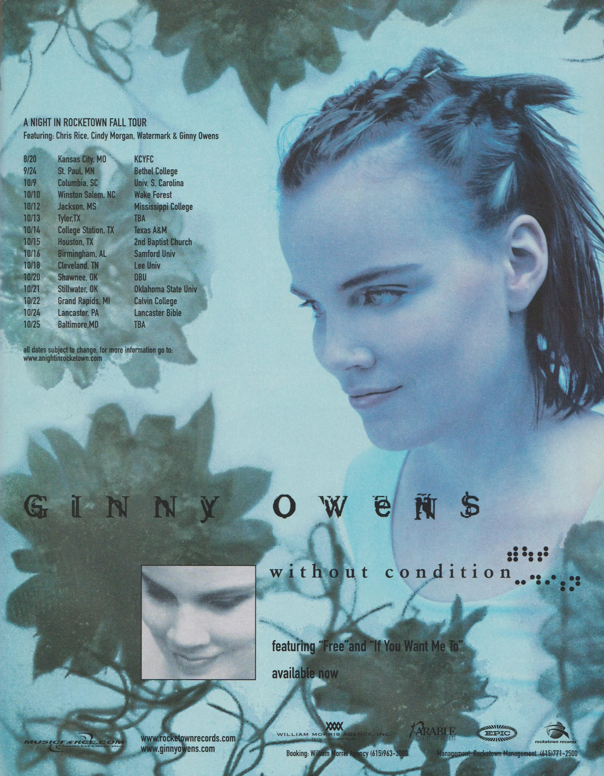 A full-page advertisement for Ginny Owens’ Without Condition was featured in the August 1999 issue of CCM Magazine.A full-page advertisement for Ginny Owens’ Without Condition was featured in the August 1999 issue of CCM Magazine.