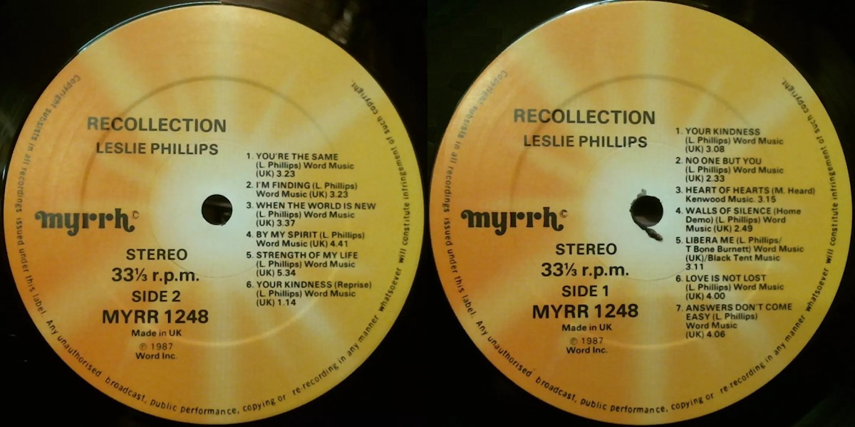 Recollection is a compilation album by the American singer and songwriter Leslie Phillips (aka Sam Phillips), released on Myrrh Records in 1987, a division of Word. Largely a collection of “greatest hits” from the Myrrh years, this album also contains a couple of new tracks including an acoustic version of “Your Kindness” and the never before released, “No One But You.” Also included is the acoustic home demo versions of “Walls Of Silence” and “You’re The Same”.