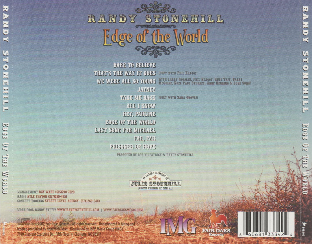 Edge of the World is a studio album by the American singer and songwriter Randy Stonehill, released on Fair Oaks Records in 2002, distributed by INSP Media Group (IMG). The album was produced, recorded, and mixed by Bob Kilpatrick and Randy Stonehill at WonWorld Studio in Fair Oaks, California.