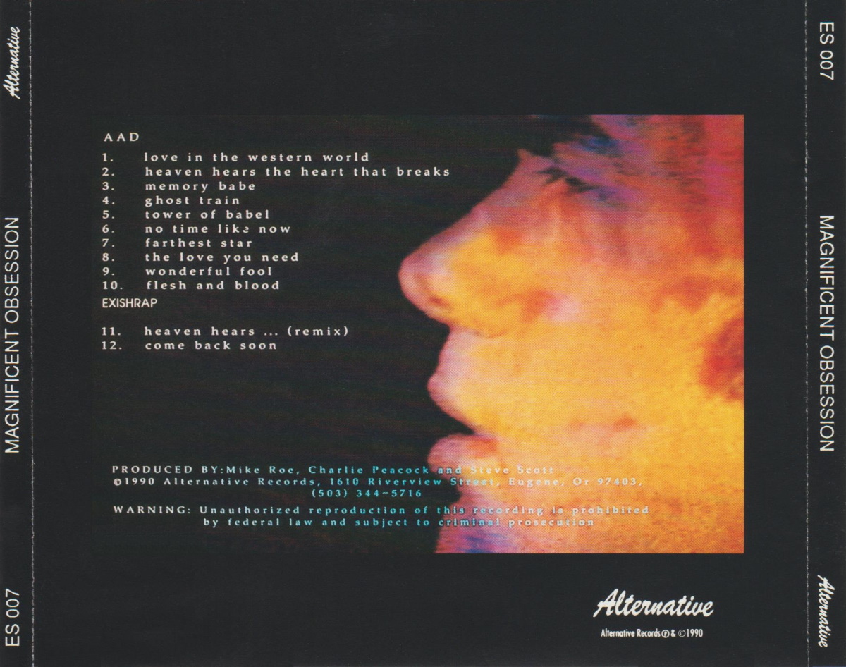 Scott’s style is difficult to pigeon-hole; David Bowie is the closest comparison that comes to mind. Both artists share similar vocal stylings, and both have a broad and unrestrained lyrical vision. Scott is certainly not a particularly “religious” lyricist, which probably explains why his audience has remained small. Although many of the songs heard on Magnificent Obsession have been traded among collectors, it is essentially a new record. An if you think of it as the second album by a “new” artist, its brilliance is indeed staggering! [Bruce A. Brown, CCM, October 1990]