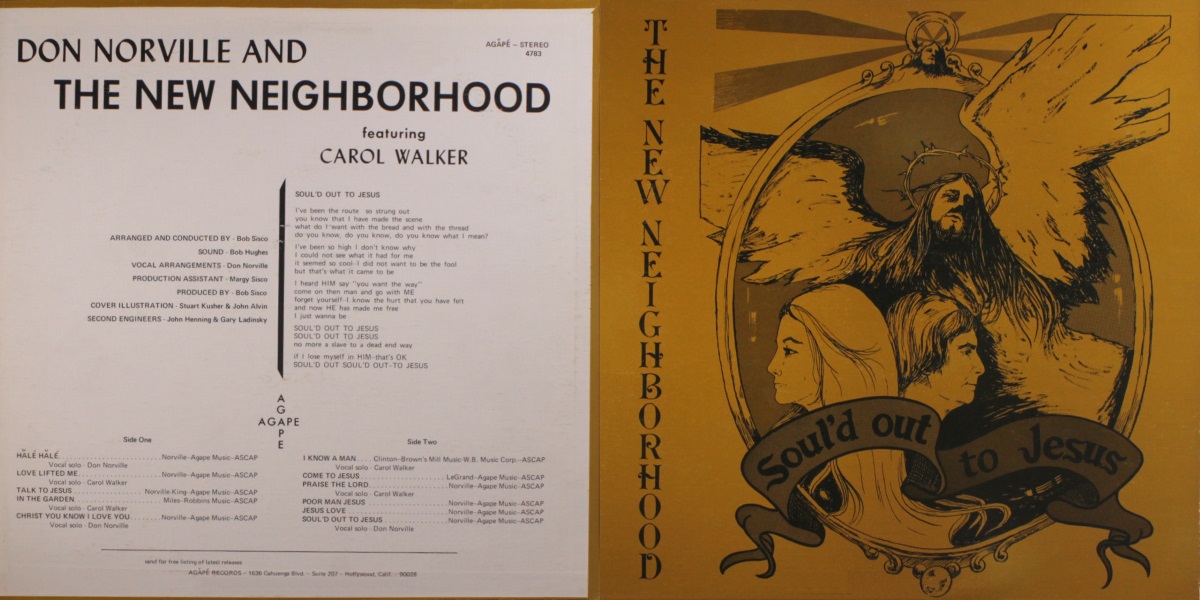 Soul’d Out to Jesus is an album by the American pop combo New Neighborhood (on this album credited to Don Norville & the New Neighborhood featuring Carol Walker), self-released on Agape Records in 1972 (??). The album was produced, arranged, and conducted by Bob Sisco, assisted by Margy Sisco. Vocal arrangements by Don Norville.