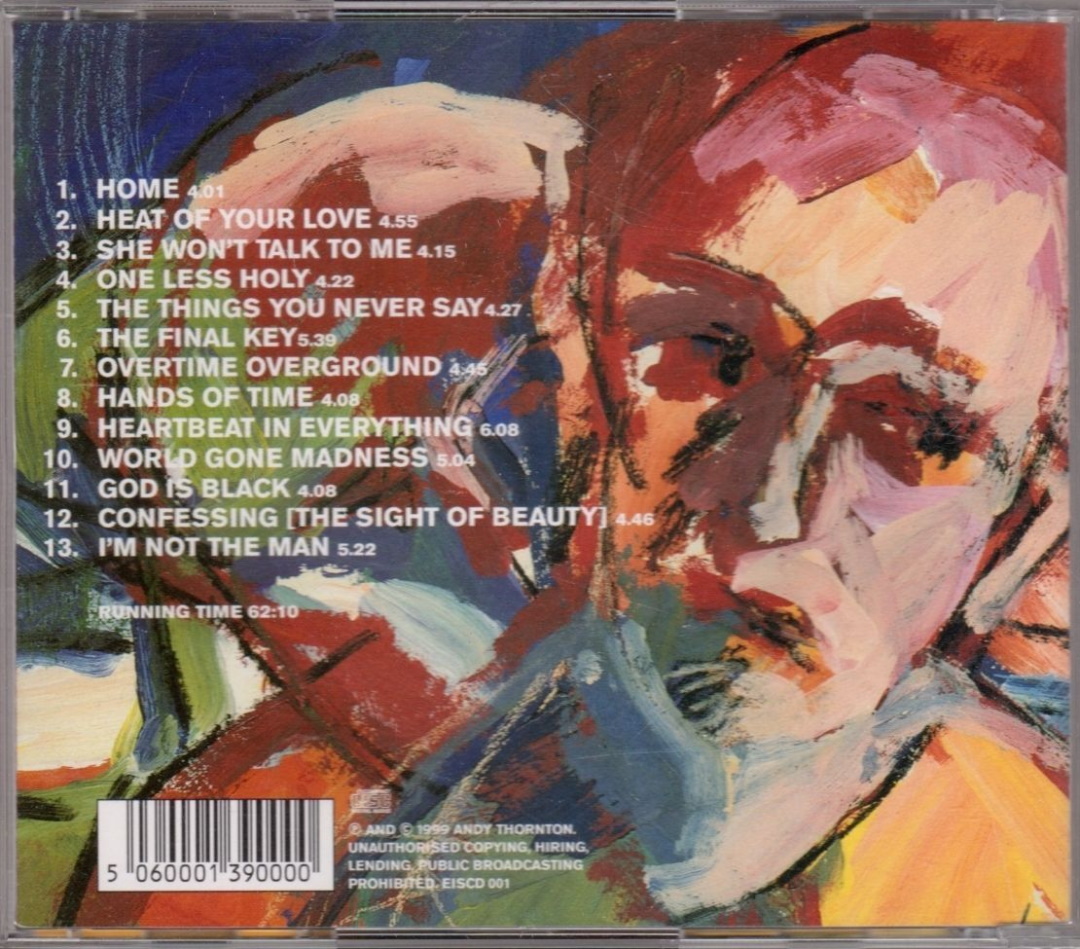 Despite being on the British CCM scene for rather a long lime, via Greenbelt, The Late Late Service and the late ’80s band Big Sur this is, I’m reliably informed, only Andy’s second album; his first, ‘Victims And Criminals‘ is still available from EIS on CD and cassette. This 13-track CD is 62 minutes and 10 seconds of wonderfully moody stuff; Andy is assisted musically by all sorts of people, including lain Archer and Miriam Kaufmann, and the whole thing was mixed and mastered al ICC Studios, so technically it’s first class. As regards the material, Andy says in the sleevenotes that he’s mildly embarrassed about the degree of angst on the album, and confesses that many of the songs were written in moments of struggle. Scanning the lyrics, I can see what he means! “I got beaten up the day she said she liked me, but we connect as friends/ Maybe I should settle for the idle chatter, once you say it’s more, you get shown the door” («She Won’t Talk To Me»); “I’m staring in an open sky; I’m wishing, but I don’t know why; some girl I’ll never see again has left me here in disarray…” («Confessing»). Even so, here are hopes and dreams amongst the pain and suffering, and whilst the Saviour’s name is never mentioned, Andy’s faith clearly manifests itself – “So send your waves upon my shore, send out your song to soothe me once more/ Lie in your wind till I am released, calling angels down/ I can’t wail another minute, heal me now” («Overtime Overground»). This is light years away from the fluffy candyfloss sort of music that sometimes passes for CCM, and Andy’s gritty vocals wring every shred of emotion out of the lyrics; I love it! Now you go and buy it. [Trevor Kirk, Cross Rhythms, February 2000]