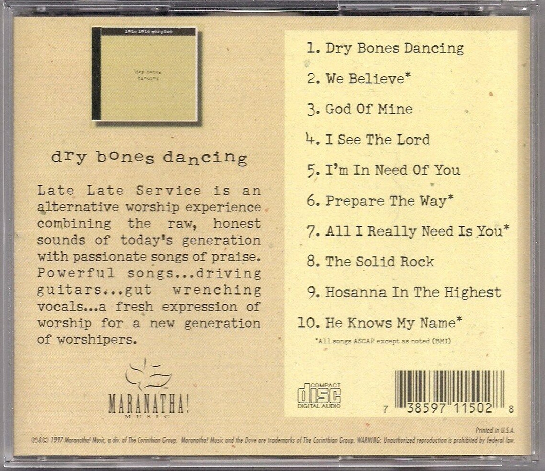 Dry Bones Dancing is a worship project by the American multi-artist combo Late Late Service, released on Maranatha! Music in 1997, a division of The Chorinthian Group, manufactured and distributed by Word Entertainment. The album was recorded by Keith Kuchta at New Earth Productions in Laguna, California; with Shawn Tubbs of The Violet Burning fame, Peter Shambrook, and Chris Lizotte producing. Mixed by Gene Eugene of Adam Again fame and Keith Kuchta at New Earth Productions.