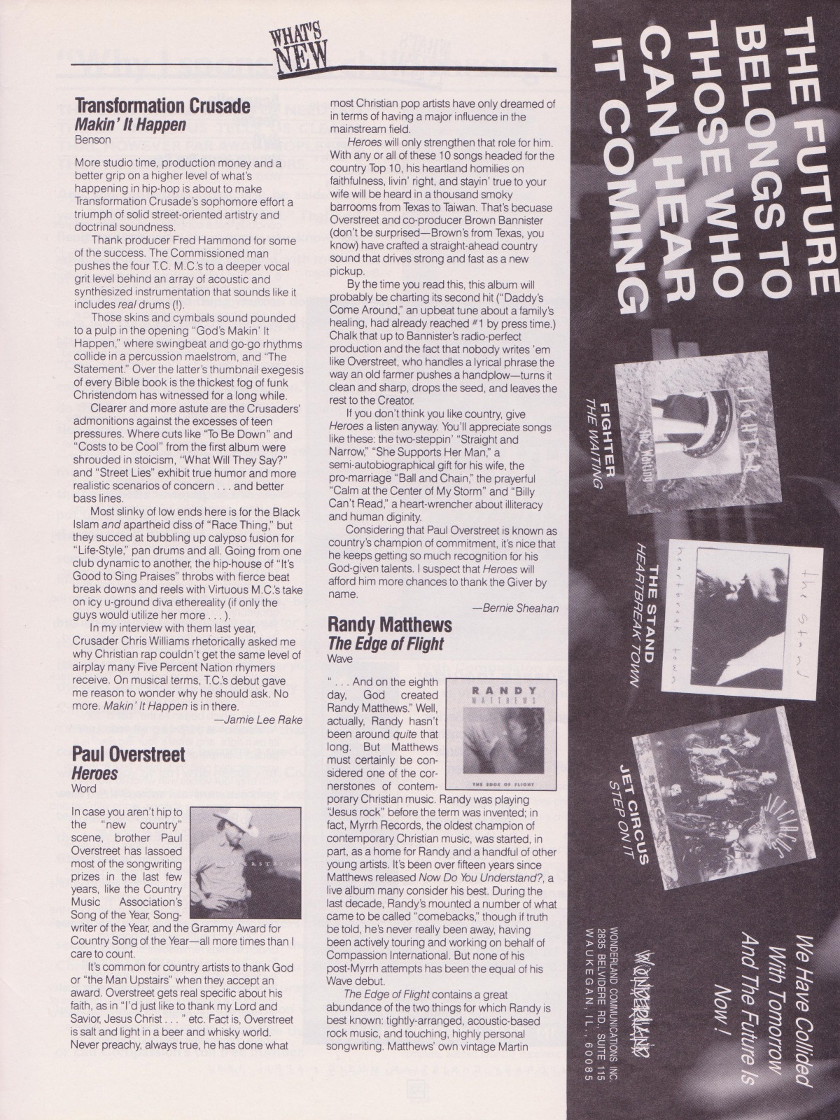 An advertisement for the Wonderland label – featuring The Waiting by Fighter, Heartbreak Town by The Stand and Step On It by Jet Circus – was published in the April 1991 issue of CCM Magazine.