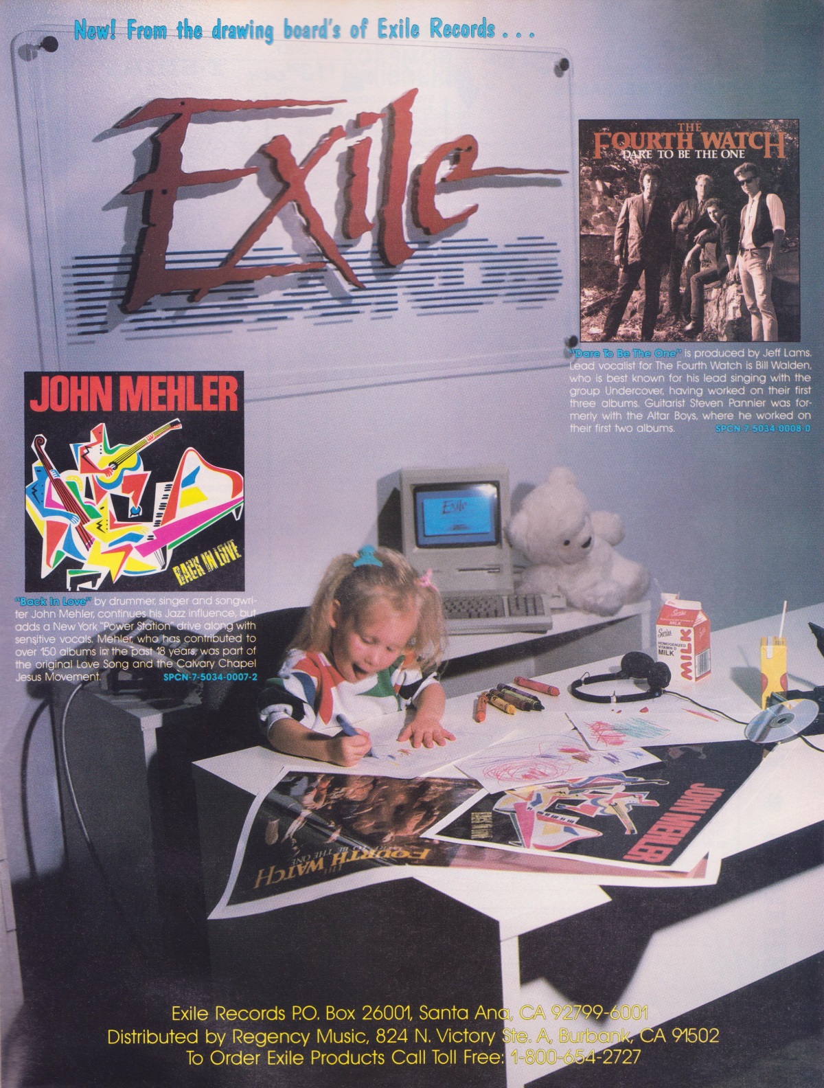 A full-page advertisement for two of Exile Records’ albums, John Mehler’s Back in Love and The Fourth Watch’s Dare To Be The One, was featured in the December 1986 issue of CCM Magazine.