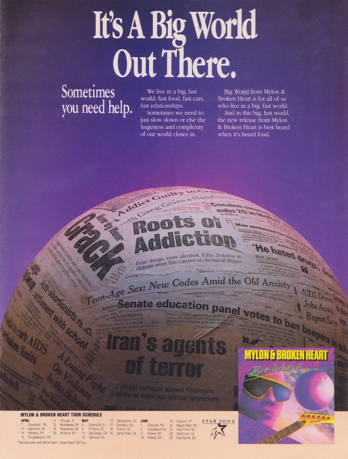 A full-page advertisement for Mylon LeFevre & Broken Heart’s new album Big World and tour was featured in the May 1989 issue of CCM Magazine.