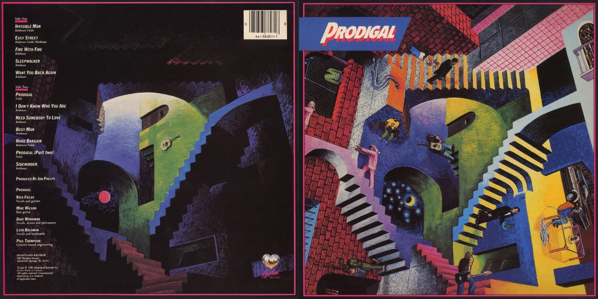 The self-titled debut album by the American pop/rock band Prodigal was released on Heartland Records in July 1982, as the label’s first effort. Later distributed by Priority Records, the gospel division of mainstream label CBS Records. (According to an article featured in the January 8, 1983 issue of Billboard Magazine, entitled “CBS gospel wing expands horizons”, “Heartland debuted in 1982 with two releases – the group Prodigal’s self-titled LP and a recent LP by John Blake, but neither has been distributed nationally. Beginning in February, Priority will distribute those LPs, plus all new Heartland releases.”) The album was recorded by Greg McNeily and Gary Platt in the Full Sail Dream Machine 24-track mobile recording studio on various locations in Florida with Jon Phelps producing. (Phelps, formerly vocalist and guitarist of Suncast, was president and part owner of Heartland). Mixed by Platt at Fifth Floor Studios. The album cover artwork is notable for mimicking M. C. Escher’s Relativity and features imagery inspired by each of the song titles.