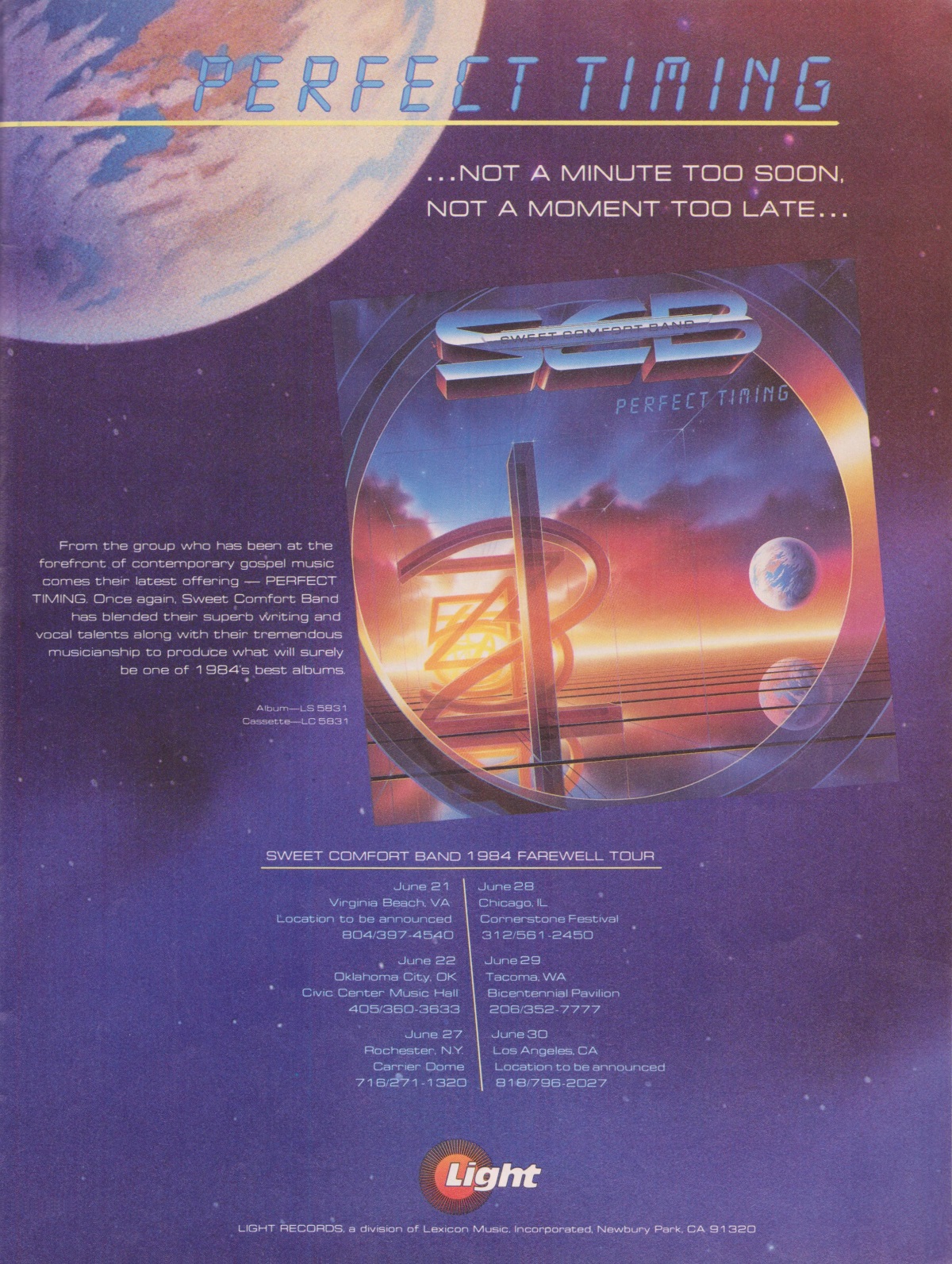 A full-page advertisement for the Sweet Comfort Band album Perfect Timing was featured in the June 1984 issue of CCM Magazine.