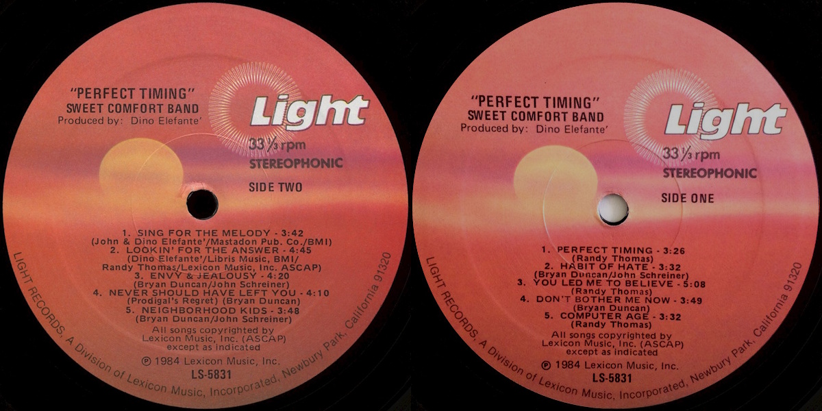 Perfect Timing is the sixth album by the American rock group Sweet Comfort Band, released on Light Records in 1984. The album was produced, recorded, and mixed by Dino Elefante at Pakaderm Studios in Los Alamitos, California; between October 1983 and March 1984. Cover artwork by Kernie Erickson.
