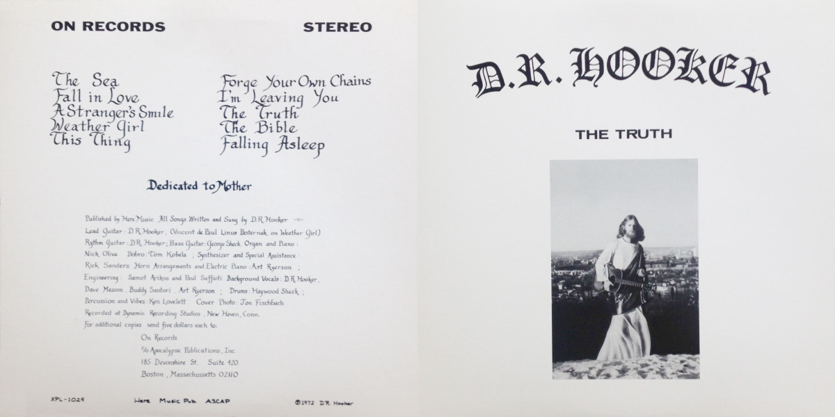Connecticut-based D.R. Hooker – a tall, slim hippy with a history of substance abuse – was much given to wearing the sort of austere robe he sports on the sleeve, a fairly outré move even then. In early 1972 he hired a gang of local scene musicians to flesh out his wonderful songs and after a few brief rehearsals the band began recording. As soon as they were done they split – some never even heard the finished album, and what a treat they missed. Hooker’s arrangements are truly beautiful; a simple, swinging pop song like «Weather Girl» exists somewhere between the Doors and Curtis Mayfield, whereas «The Bible» (“If they’re knocking the Bible, be sure they are bent/ Just see and you’ll understand the book is heaven sent”) has the propulsive drive of a pained George Harrison ballad crushed up against some of Neil Young’s freeform, string-banging joy. Then there’s «The Sea», with its rolling religious allegories and the remarkable «Free» which marries a growling hard rock throb to a vampirically groovy synth line. Hooker’s masterpiece is «Forge Your Own Chains», which is part conga-led, lounge-funk soul and part, questing psychedelic dream. [The Guardian, April 2013]
