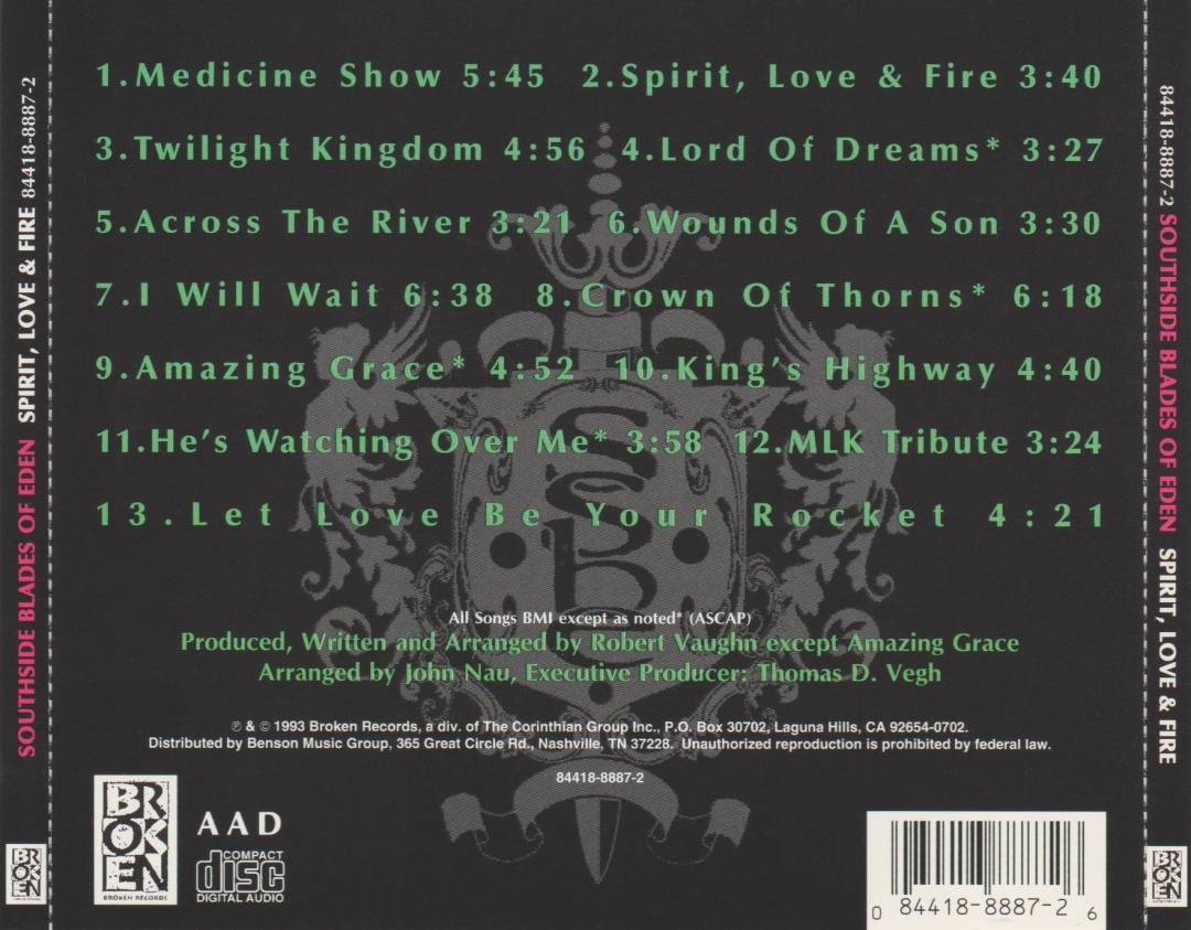 Spirit, Love & Fire is an album project by the American singer and songwriter Robert Vaughn under the moniker Southside Blades of Eden, released on Broken Records in June 1993, a division of The Corinthian Group, distributed by Benson Music Group. This purely analog recording was recorded and mixed at Signature Sound in San Diego, California; and was produced, written and arranged by Robert Vaughn. Digitally mastered by Doug Sax at The Mastering Lab in Hollywood, California; assisted by Gavin Lurssen.