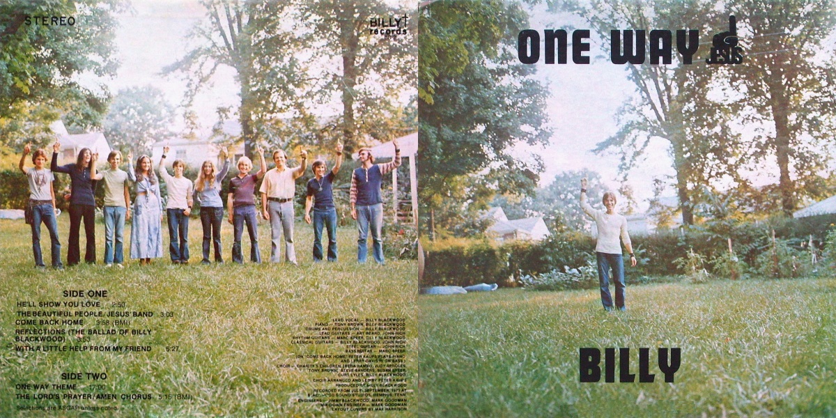 Big strides forward as Billy’s bunch aims more for a low-tech garage band sound with Southern leanings ala Mylon’s We Believe. Mostly self-composed this time, the centerpiece being side two’s epic 17-minute «One Way Theme», an ambitious piece with progressive overtones and Tommy flourishes that begins and ends with Chicago’s intro to «Does Anybody Know What Time It Is?». That track affords Billy opportunity for heavier skin pounding, not to mention some decent sections of guitar jamming and fuzz action. More raw fuzz can be found on the opening basement rocker «He’ll Show You Love» and a soulful cover of «With A Little Help From My Friends» (the Joe Cocker version, with lyric changes). Also some quieter songs, including «Reflections (The Ballad Of Billy Blackwood)». Female backup singers helping him out here and there. Incredibly cheap-o cover photo of Billy in big yard pointing finger up. [Ken Scott, The Archivist, 4th Edition]
