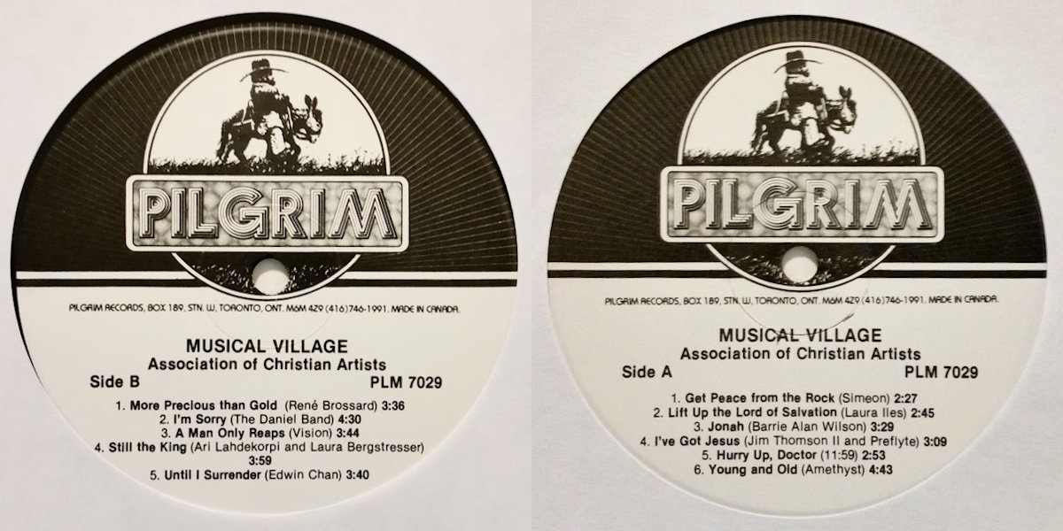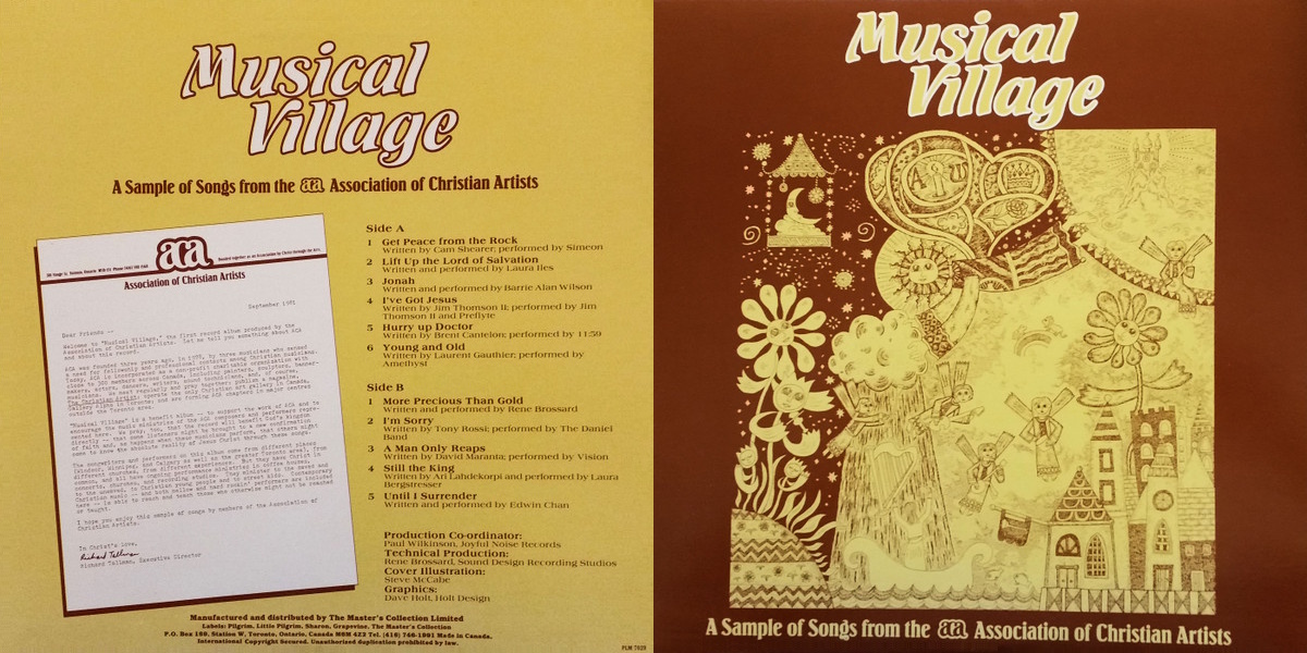 Musical Village, sub-titled A Sample of Songs from the Association of Christian Artists, is a multi-artist compilation featuring various Canadian artists, released on Pilgrim Records, manufactured and distributed by The Master’s Collection Limited in 1982. (Labels: Pilgrim, Little Pilgrim, Sharon, Grapevine, The Master’s Collection.) Technical production by Rene Brossard, Sound Design Recording Studios.