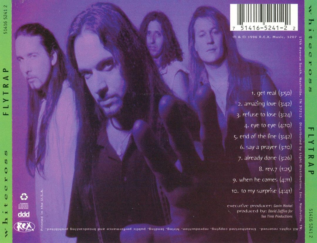 With nearly as high turnover of personnel as Petra, the newly reconstituted Whitecross bounce back onto our CD players with a disc that rock’n’rolls like a good tin. This is Scott Wenzel with three new guys to support him and in Quinton Gibson, he’s found a guitarist to match plank spanking attack what he spits out in storming gutsy vocals. Heavy riffs abound but there are also the blues-influenced «When He Comes» and «Refuse To Love». «Eye To Eye» has an acoustic undercurrent without losing any rock energy. Producer David Zaffiro manages to pull out of the guys a performance which combines sheer power with deft touches of melody, demonstrated on the chorus of «End Of The Line» or «Already Done». But there is one song in this set which is an absolute awesome killer and that is «Get Real». It’s a challenge to avoid the temptations of the flesh because they look attractive on the outside but rot the soul. This song is wrapped up in explosive guitar pyrotechnics and a pleading Wenzel vocal which tears you apart. Passion personified ‘Flytrap’ has enough musical moments to snare the avid rock fan. And deserves to! [Mike Rimmer, Cross Rhythms, June 1997]