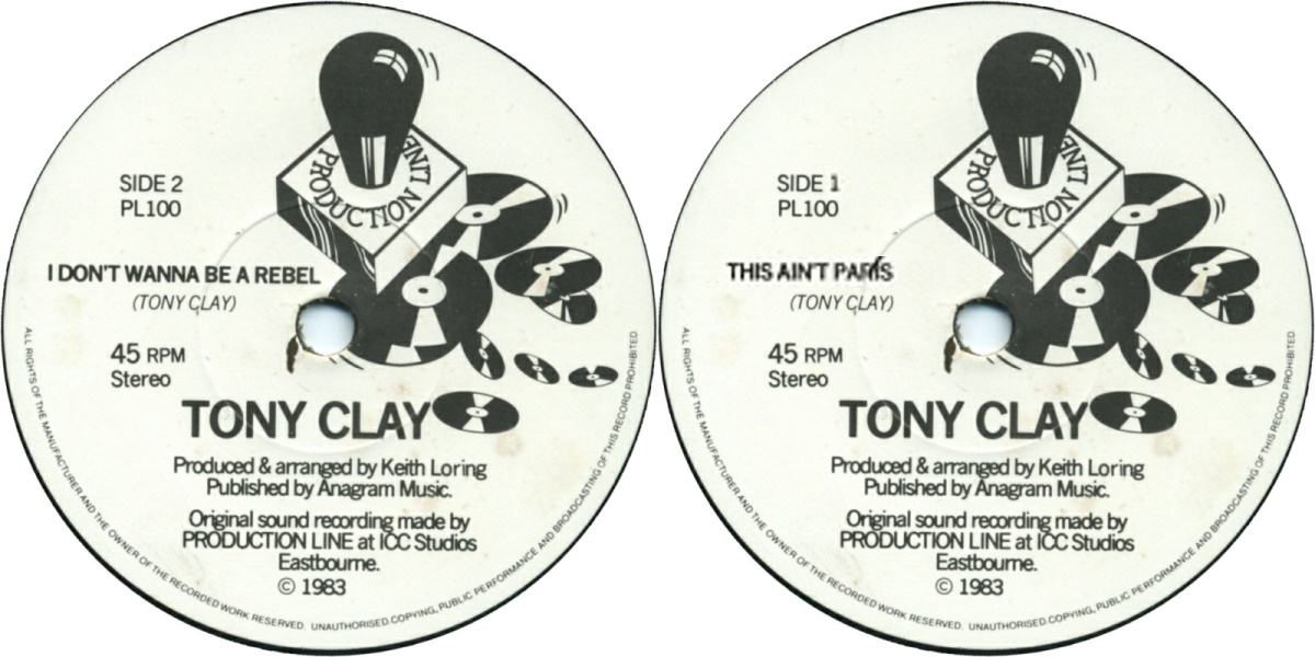 This Ain’t Paris – b/w “I Don’t Want to Be a Rebel” – is a two-sided 7-inch vinyl single by the British singer and songwriter Tony Clay, independently released on Production Line in 1979 (catalogue number PL100). The two tracks were later included on Clay’s full-length album When You’re Down at the Bottom… You Can Only Look Up! released on Production Line in 1983.
