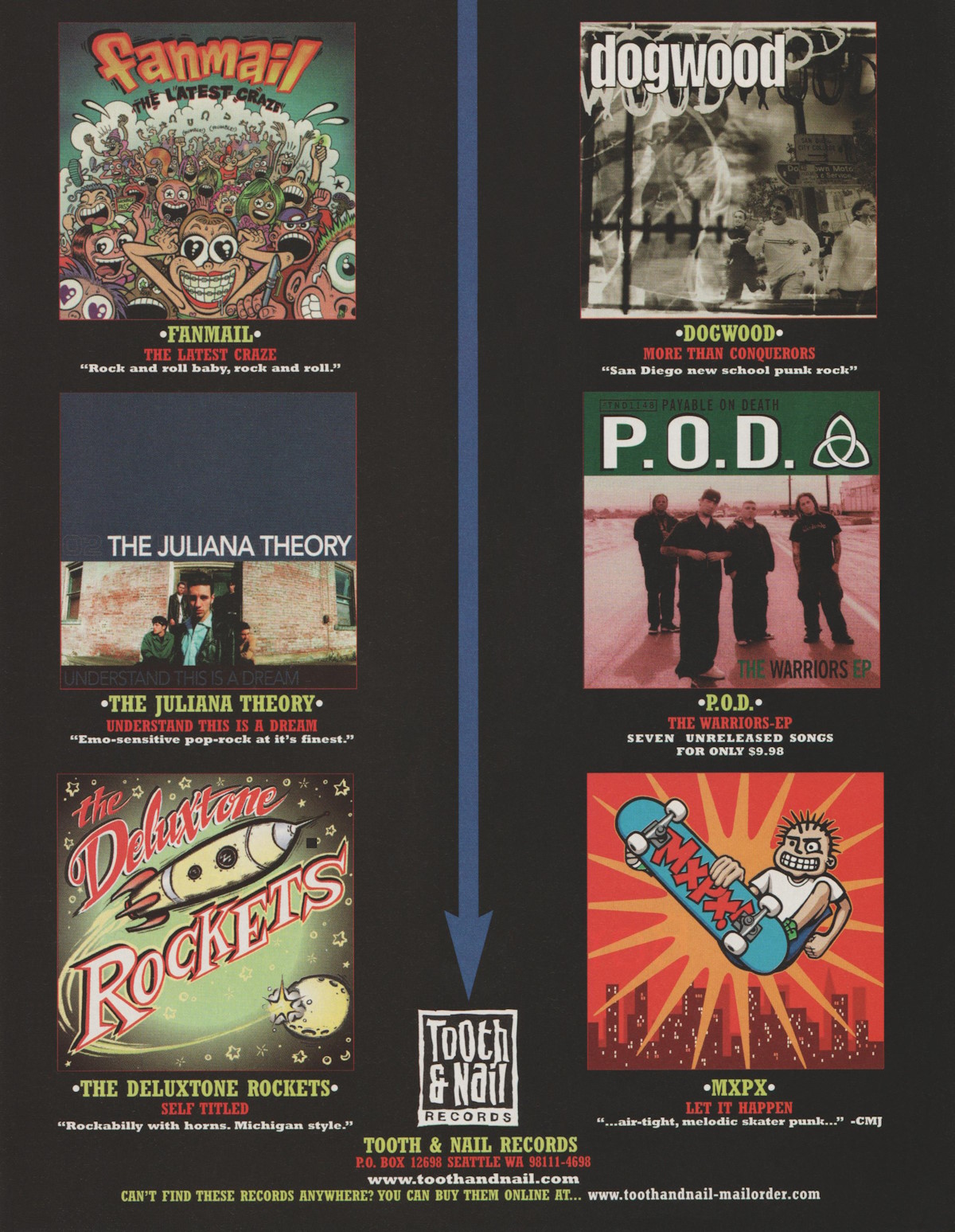 A full-page advertisement for various new releases on Tooth & Nail Records, including MxPx’s Let It Happen, was featured in the July 1999 issue of CCM Magazine.