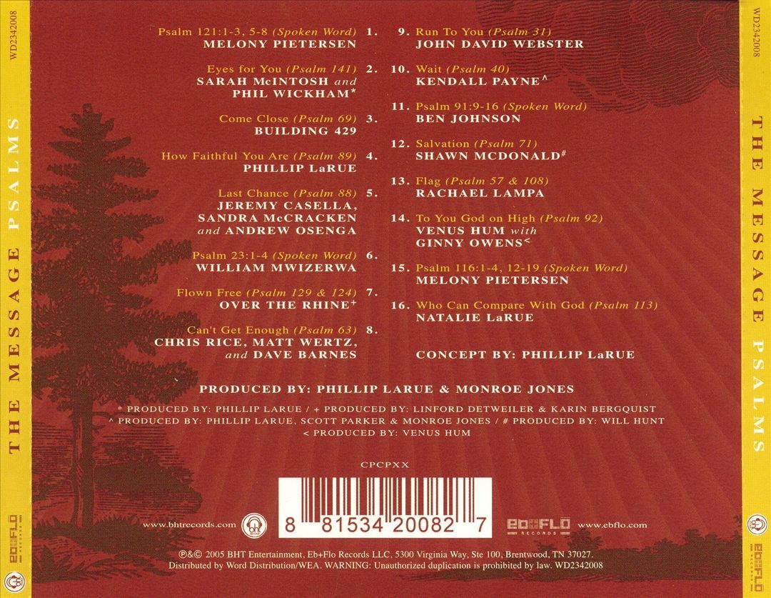 The Message: Psalms is a multi-artist compilation featuring music based upon the Psalms as presented in The Message, released on Eb+Flo Records in 2005, distributed by Word. A wide range of vocalists and bands take center stage with their original work for this project, including artists like Over the Rhine, Kendall Payne, Rachael Lampa, and Chris Rice. As well, four of the album tracks are completely spoken word, simply reading the Psalms.
